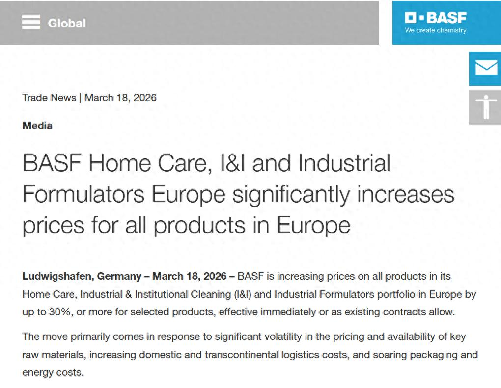 全球化工巨头巴斯夫(BASF)周三发表声明称,将对其在欧洲地区的家用护理、工业与机构清洁(I&I)以及工业配方业务组合中的全部产品提价,涨幅幅度可达30%,甚至还有“个别产品涨幅更高”。