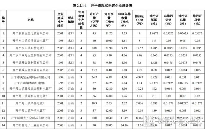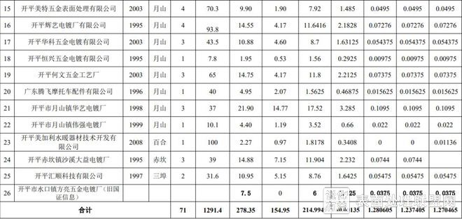 经统计,开平市目前在产电镀企业(含配套电镀生产工序的企业)26 家,均已核发排污许可证。其中月山镇 17 家,数量占全市的 65.4%,另有水口镇 6 家,三埠镇、百合镇、赤坎镇各 1 家。共有电镀生产线 71 条,电镀能力为 1291.4 万平方米/年;按照排污许可证允许排放量, 总废水排放量为 285.85 万 m3 /a。