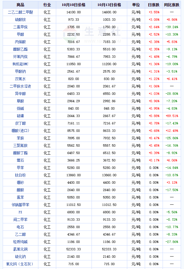 据生意社价格监测,2025年10月13日大宗商品价格涨跌榜中化工板块环比上升的商品共21种,涨幅前3的商品分别为二乙二醇二甲醚(3.55%)、硫酸铵(3.08%)、二氯甲烷(2.64%)。