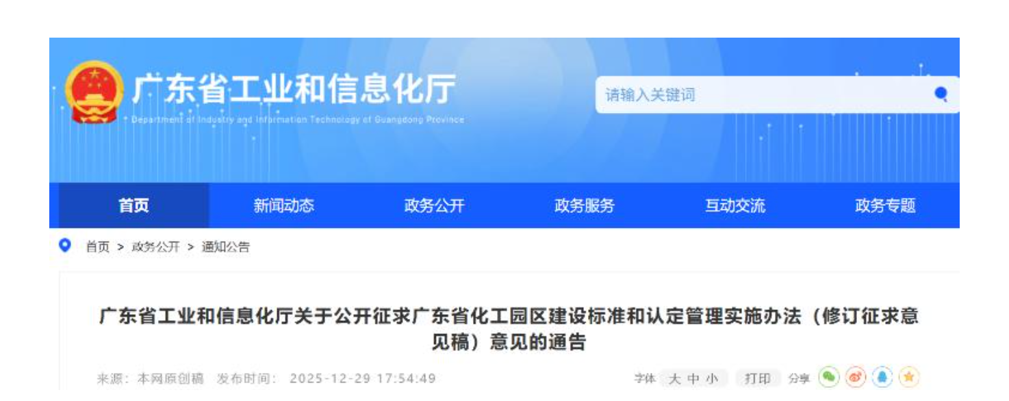 广东省工业和信息化厅关于公开征求广东省化工园区建设标准和认定管理实施办法(修订征求意见稿)意见的通告