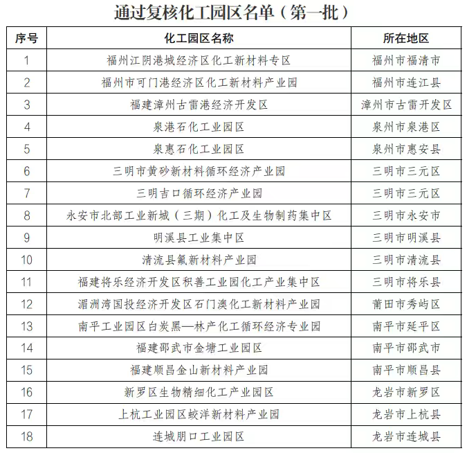 近日,福建省工业和信息化厅等八部门公布通过第一批复核化工园区名单,福州江阴港城经济区化工新材料专区等18个化工园区通过复核。