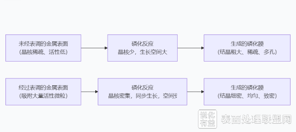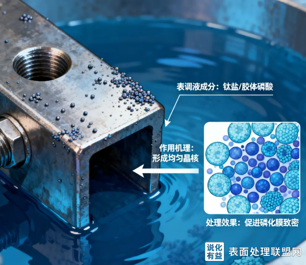 表面调整(简称“表调”)的工作原理,可以通俗地理解为在金属表面播撒大量均匀且密集的“种子”(晶核)。这样一来,后续的磷化反应就会在这些种子上同时快速地生长,最终形成一层细密、均匀的高质量磷化膜,而不是稀疏粗糙的晶体。
