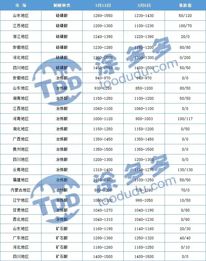 本周硫酸市场延续涨势,市场上调幅度多在80-100元/吨左右,截至目前,山东地区98%冶炼酸出厂价格在930-1250元/吨,98%硫磺酸出厂价格在1280-1550元/吨,四川地区98%硫磺酸出厂价格在1450-1550元/吨,云南地区98%冶炼酸到厂价格在1310-1400元/吨;本周硫酸市场上涨主要受成本价格较高支撑以及下游市场需求稳步释放,因中东冲突影响,原料硫磺价格攀升至高位,硫磺制酸生产成本增加,市场开工负荷进一步减少,3月国内冶炼酸部分主力工厂进行检修周期,硫酸货源供应紧张加剧,企业新单报价陆续进行上调;下游磷肥及化工等行业需求维持稳定,企业维持刚需采购节奏,市场交投氛围良好,对硫酸价格上行提供支撑;目前硫酸供需紧张情况持续,而随时酸价持续大幅上涨,下游企业成本压力陆续凸显,虽部分下游产品价格有所上调,但成本压力仍较大,企业也多持观望心态;短期来看,原料硫磺供应短时间较难缓解,硫酸成本巨高不下,市场看涨情绪仍存,硫酸价格预计将维持高位走势运行。