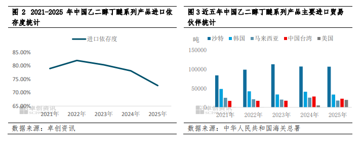 对于中国乙二醇丁醚系列产品来看,2025年行业进口依存度在72.6%,市场供应依旧以进口为主,其中沙特乙二醇丁醚系列产品相关产能达20万吨/年,2025年出口到中国货量在10.6万吨左右,在中国乙二醇丁醚系列进口中占比高达53.20%,其中2025年乙二醇丁醚进口到货量在7.8万吨左右,进口占比达53.81%,二乙二醇丁醚进口到货量在2.8万吨左右,进口占比达51.42%,沙特是中国最大的乙二醇丁醚/二乙二醇丁醚进口贸易合作伙伴。
