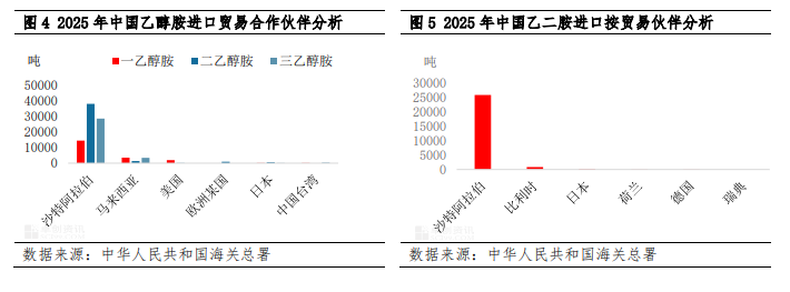近五年,中国乙醇胺产能快速提升后,中国乙醇胺行业进口也有了一定的下滑趋势,中国乙醇胺进口由2021年最高值16万吨下滑至2024年的7.37万吨。2025年由于国内装置检修计划较多,行业进口有一定上涨趋势,全年进口上涨至9.38万吨左右,乙醇胺行业进口依存度在13%,从乙醇胺进口贸易合作伙伴来看,2025年沙特出口至中国乙醇胺数量在8.13万吨,在进口中占比高达87%,是中国最大的进口贸易合作伙伴。