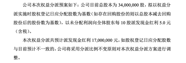 永辉化工此次2019年年度权益分派预案为,公司目前总股本为3400万股,拟以权益分派实施时股权登记日应分配股数为基数(如存在回购股份的则以总股本减去回购股份后的股份数为基数),以未分配利润向全体股东每10股派5元(含税),本次权益分派共预计派发现金红利1700万元。