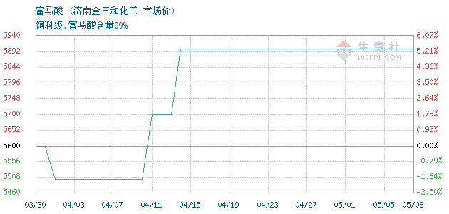 今日富马酸含量99%市场价5900元/吨,饲料级。4月份一来一直持续高价,飚上去后没有下降的趋势。济南金日和化工有限公司提供报价