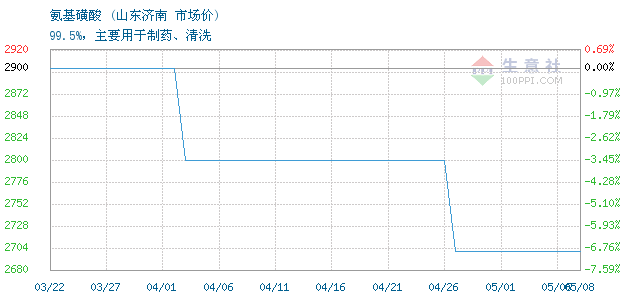 今日氨基磺酸99.5%市场价2700元/吨,从3月份2900到现在的2700,下降了200元/吨。持续下降状态,但是2700元/吨有望保持较长时间。济南金日和化工有限公司提供报价。