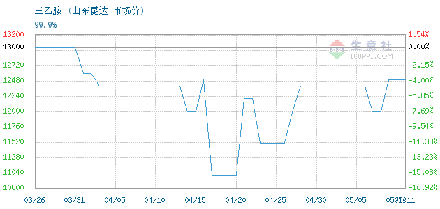 今日99.9%三乙胺市场价12500元/吨。曾在3月份出现过1300元/吨的价格,也在4-17到4-20日报价11000元/吨。一直起伏不定。相当不稳。济南金日和化工有限公司提供报价。
