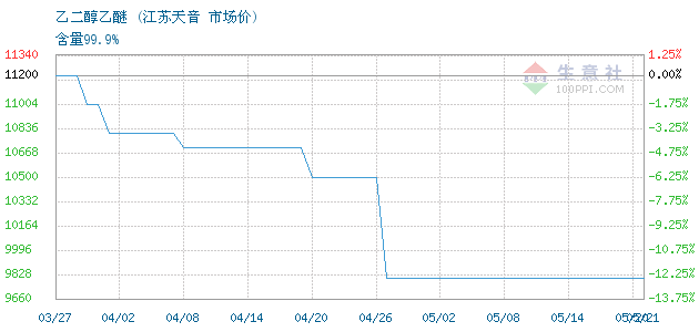 今日江苏天音含量99.9%乙二醇乙醚最新市场价9800元/吨;济南金日和化工有限公司报提供报价。