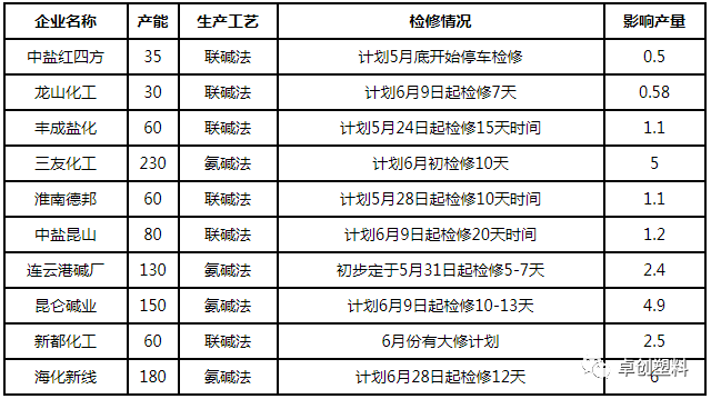从供应面看,本周检修、限产企业涉及产能934万吨,5月下旬到6月份计划检修有9家,涉及产能1050万吨,预计影响产量25.28万吨。本月仍将有部分美国碱进入国内市场,SA05合约交割货源有2.322万吨。在下游需求恢复缓慢的情况下,高库存的消化仍需要一段时间。