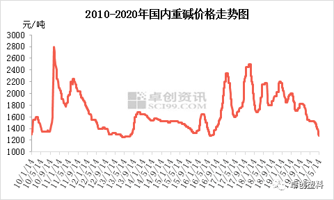 从2019年10月份开始,纯碱现货市场进入漫漫熊市,一直延续到现在。目前国内重碱价格已经创十年新低,部分区域轻碱价格也已经创十年新低。目前轻碱主流终端价格在1150-1250元/吨,轻碱均价较9月底价格下滑28%,重碱主流终端价格在1180-1350元/吨,较9月底价格下滑30%。