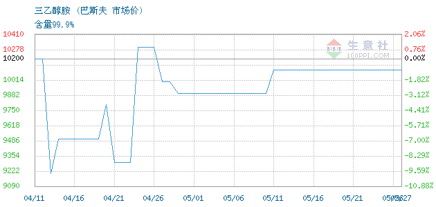 今日含量99.9%巴斯夫三乙醇胺终端零售价11.6-12.1元/公斤,出厂价10100元/吨。