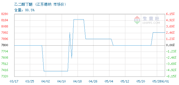 今日含量99.5%乙二醇丁醚终端零售价9.6-10元/公斤,出厂价8000元/吨。