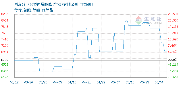 今日优等品丙烯酸终端零售价8.4-8.8元/公斤,出厂价7000元/吨。