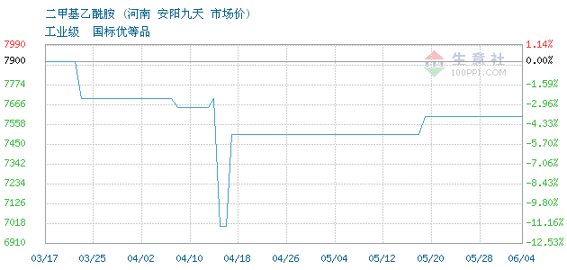 今日工业级 国标优等品二甲基乙酰胺终端零售价9.12-9.5元/公斤,出厂价7600元/吨。