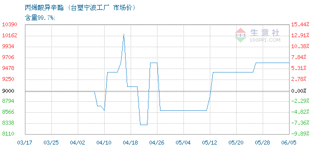 今日含量99.7%丙烯酸异辛酯终端零售价11.52-12元/公斤,出厂价9600元/吨。