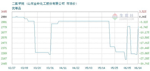 优等品二氯甲烷终端零售价3.9-4.2元/公斤,出厂价2800元/吨。