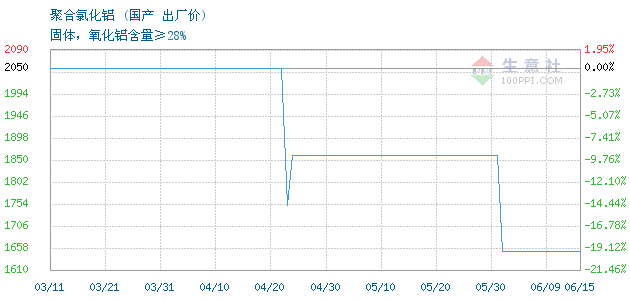 今日固体含量≥28%聚合氯化铝终端零售价2.3-2.5元/公斤,出厂价1650元/吨。