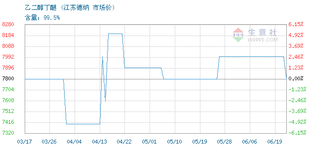 今日含量99.5%乙二醇丁醚终端零售价10.1-10.5元/公斤,出厂价7800元/吨。