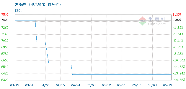 今日1801硬脂酸终端零售价8.3-8.6元/公斤,出厂价6400元/吨。