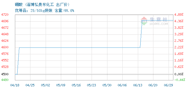 今日优等品含量>99.6%硼酸终端零售价6.6-7.1元/公斤,出厂价4700元/吨。