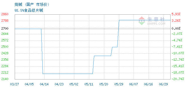 今日含量98.5%食品级片碱终端零售价3.9-4.2元/公斤,出厂价2800元/吨。
