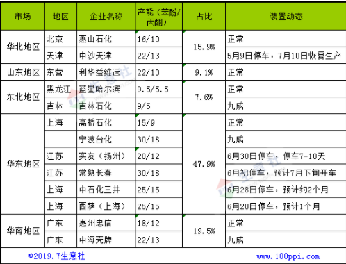 进入7月份,目前全国苯酚工厂来看,开工率下滑至6成。而7月份,天津中沙35万吨/年酚酮装置预计在7月10日开车,上海西萨化工40万吨/年酚酮装置预计在7月下旬开车,扬州实友32万吨/年酚酮装置预计7月10日开车,中石化三井40万吨/年酚酮装置6月28日停车,预计8月底开车。因此7月下旬来看开工率有望回升,供应来看比较充足,需求端来看买气低迷,行业景气度不佳,工厂开工也在逐步下滑,而国际情况来看,部分工厂逐步复工,进口量稳中上升。生意社预计,需求面难言利好,供应利空充斥下,苯酚市场短期低迷难改,预计7月份市场苯酚在6400-6800元/吨。