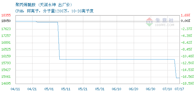 今日CPAM 阳离子 分子量1200万 10-30离子度聚丙烯酰胺终端零售价18-18.8元/公斤,出厂价15000元/吨。
