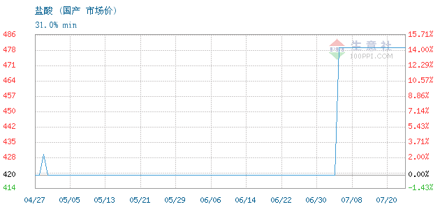 今日含量31.0% min盐酸终端零售价0.7-1元/公斤,出厂价480元/吨。价格有所上升。