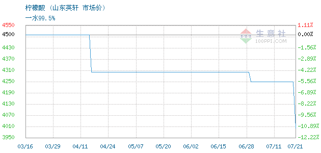 今日一水99.5%柠檬酸终端零售价5.4-5.8元/公斤,出厂价4000元/吨。价格有明显下降,波动较大,可能还有下降空间,可观望也可根据需求适当购买。
