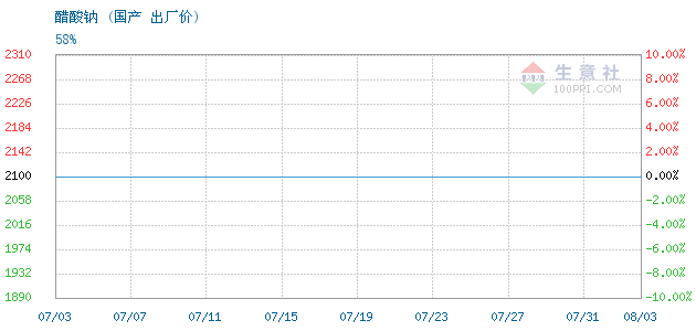 今日含量58%醋酸钠终端零售价2.9-3.2元/公斤,出厂价2100元/吨,价格保持平稳。
