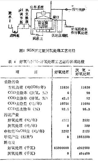 SGN公 司 已应用 厌氧技术来 处理食品工 业废水 。 八十 年代 中期该公司开 始转 向于化 工废水厌氧处理技术的研究与开发 , 这项研 究 工作曾 得到 法 国 化工 厂 的支持与合 作 。 在 米 中试装 置 的研究 基础上 , 投 资 万法 郎 , 开发 了规 模为 米 “ 的工业化下 流式 固 定 膜厌氧装置 。 以厌氧一 好氧生物联 合处理 工艺来 处理 化工厂 的工业废水 。 这种废水 的成分 以短链 脂肪 酸为主 , 高达 一 克 升 , 为 一 。 该 处理系统 日处理量为 米 “ , 厌氧 去 除 。吨 年 , 去除率 , 沼 ‘ 气产 量 标米 日 。 图 为 固 定膜 厌 氧处理工艺 。 表 是 , 厌氧一 好 氧 生 物工 艺 的运 行状况 。