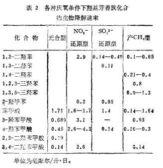 具 有单环苯衍生物或化合物 的 同类芳香族化合物的厌氧降解性 的研究 , 大 多集 中于 经基苯和苯 甲酸 等化 合物 。 它 们可 在光 合 型 、 硝 酸盐还原 型 、 硫酸盐还 原 型与产 甲烷 型四 种厌氧条件下 被降解 。 由 已 有的研究结果 发现 , 产甲烷条件下 的厌氧降解速率低于 光合 型 、 硝酸盐还原型 的降解速率 见 表 。