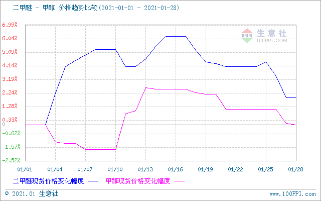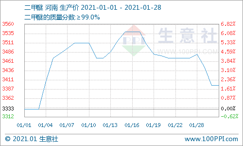 1月,二甲醚市场上半月以涨价为主,下半月走势却连续下跌,仅中旬在3500元/吨的关卡上维持了短短几天,价格便又跌回3500元以下,截止28日,主产区河南均价与月初相比仅差几十元。据生意社数据监测,1月1日二甲醚河南市场均价在3333.33元/吨,1月28日均价在3396.67元/吨,月内上涨1.90%,最大震幅为6.20%。截止1月28日,二甲醚国内各地区市场价格如下: