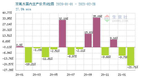 根据2020年1月-2021年2月,双氧水月度涨跌图可以看出,2020年双氧水一季度表现不佳,2月开始连跌了4个月,主要是因为双氧水出口订单受限,终端造纸印刷等厂家开工延迟。2021年双氧水已经连跌了两个月,跌幅依旧超过30%。3月初,双氧水依旧没有好转的迹象,继续下跌为主。截止3月4日,双氧水较2月初价格下跌24.9%。