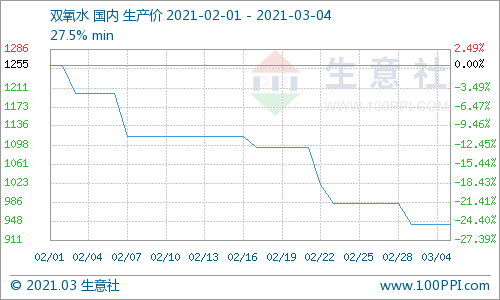 据生意社监测数据显示:2月开始,双氧水价格进入下行通道,价格跌跌不休。春节过后,行情依旧弱势下跌为主。直至3月行情依旧下跌为主,截止3月4日,双氧水市场均价跌至942元/吨,价格较2月初下跌24.9%。