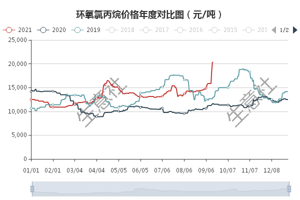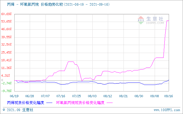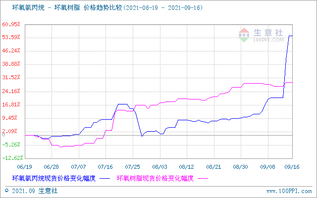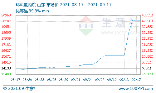 据生意社大宗榜数据显示,截止到9月17日上午,环氧氯丙烷企业报价均价为20333.33元/吨,与周一价格相比上涨了28.15%,与8月17日价格相比上涨了43.87%,以三个月为周期同比上涨了55.22%。