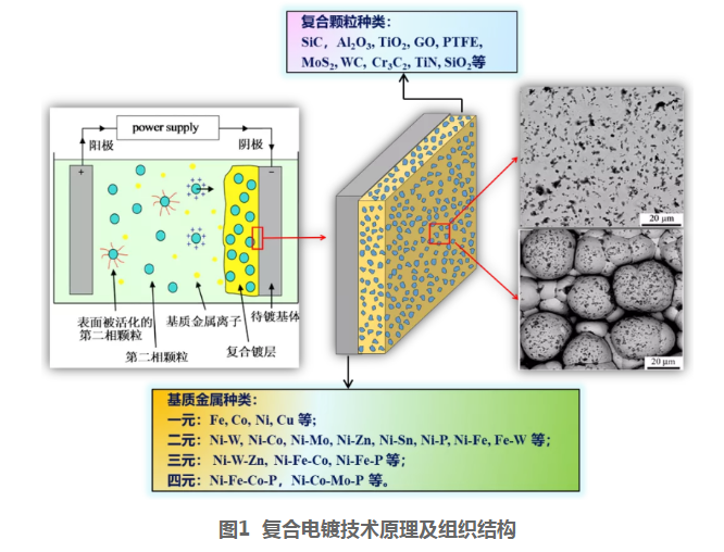 电镀技术作为一种传统的表面处理技术广泛应用于工业领域,但其环境污染、功能性镀层种类少等制约了其进一步发展。复合电镀技术可通过选用不同的基质金属及第二相颗粒(纤维)配制环保型的复合镀液,逐步替代电镀铬等高污染传统工艺,获得耐磨、耐蚀、减磨、导电、导磁、抗氧化及超疏水等功能镀层,具有绿色环保、成本低廉、操作简单以及镀层性能的自由度大、可控性好等优点,广泛应用于机械制造,国防,航空航天以及电子制造业等领域。