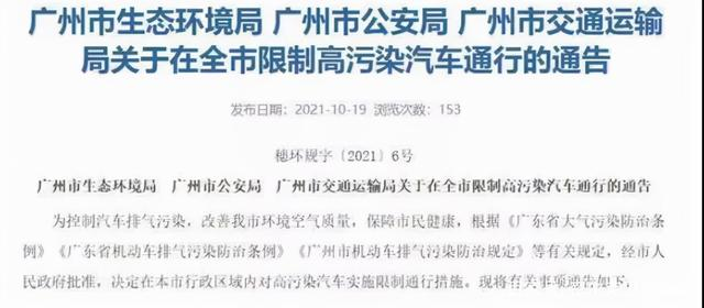 广州市生态环境局、广州市公安局、广州市交通运输局发布关于在全市限制高污染汽车通行的通告,表示:12月1日起,全天24小时限制高污染汽车在全市通行。