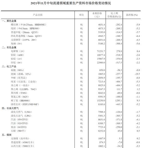 回顾化工市场11月行情,价格下降的速度堪比寒潮降温。根据国家统计局发布的2021年11月中旬流通领域重要生产资料市场价格变动情况,全国流通领域9大类50种重要生产资料2021年11月中旬与11月上旬相比,35种下降,其中包括黑色金属、化工产品、石油天然气、煤炭、非金属建材路、农业生产资料、林产品等大类下的多个小类。焦煤(主焦煤)下跌19.8%,烧碱(液碱,32%)下跌19.5%,焦炭(二级冶金焦)下跌16.8%,复发平板玻璃(4.8/5mm)下跌11.2%,降幅均较大。