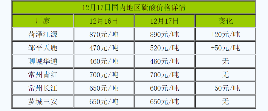 12月17日国内地区硫酸价格详情