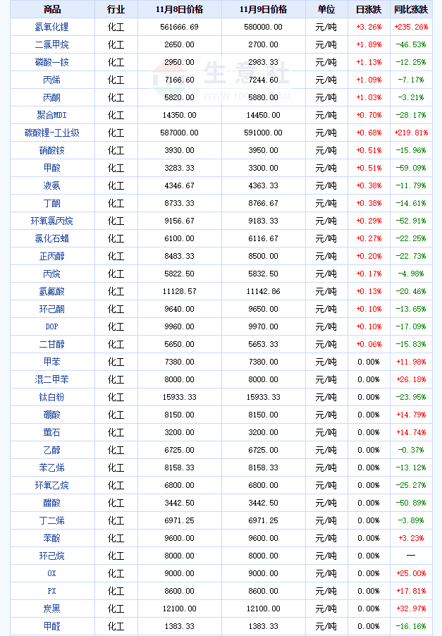 2022年11月9日,大宗商品价格涨跌榜中化工板块环比上升的商品共19种,涨幅前3的商品分别为氢氧化锂(3.26%)、二氯甲烷(1.89%)、磷酸一铵(1.13%)。环比下降的商品共有25种,跌幅在5%以上的商品共1种,占该板块被监测商品数的0.9%;跌幅前3的产品分别为三氯甲烷(-5.45%)、苯胺(-3.93%)、硝酸钾(-3.29%)。