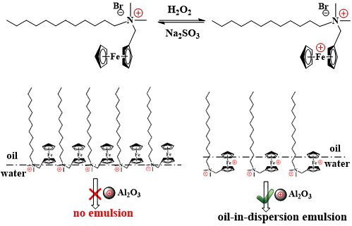 该课题组发现一种含有二茂铁基团的“空间位阻”表面活性剂(FcN+C12),其结构能在单头单尾型(FcN+C12)和双头单尾型(氧化态,Fc+N+C12)间可逆转变,其头基附近的二茂铁基团令该类表面活性剂在油/水界面上排列疏松,高浓度时仍无法实现乳状液的稳定。但在微量纳米氧化铝颗粒的协同作用下,Fc+N+C12能在较低的浓度下稳定oil-in-dispersion乳状液,从而构建了氧化-还原响应的智能型乳状液。另一方面,通过改变体系的pH可以进一步实现oil-in-dispersion乳状液与Pickering乳状液的可逆转变。