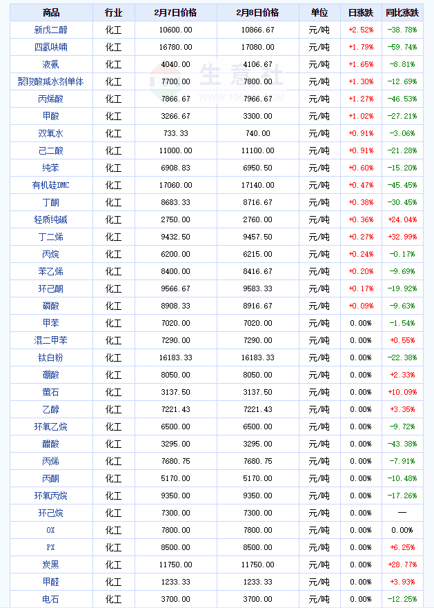 据悉,截止2023年2月8日17点,国内大宗商品价格涨跌榜中化工板块环比上升的商品共17种,涨幅前3的商品分别为新戊二醇(2.52%)、四氢呋喃(1.79%)、液氨(1.65%)。环比下降的商品共有18种,跌幅前3的产品分别为二甘醇(-2.76%)、DOP(-1.35%)、双酚A(-1.11%)。