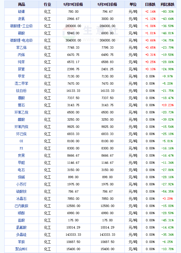 截止5月30日17点,国内大宗商品价格涨跌榜中化工板块环比上升的商品共9种,涨幅前3的商品分别为硫磺(2.14%)、液氨(1.12%)、碳酸锂-工业级(1.06%)。环比下降的商品共有33种,跌幅在5%以上的商品共1种,占该板块被监测商品数的0.9%;跌幅前3的产品分别为溴素(-5.15%)、丙酮(-4.79%)、丁二烯(-3.73%)。