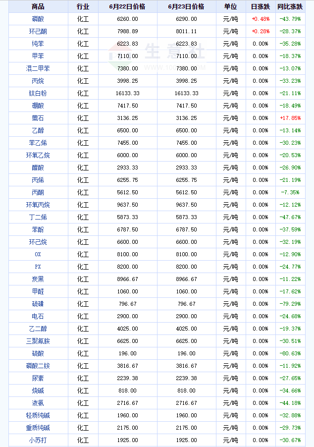截止2023年6月23日17点,国内大宗商品价格涨跌榜中化工板块环比上升的商品共2种,涨幅前2的商品分别为磷酸(0.48%)、环己酮(0.28%)。环比下降的商品共有0种。