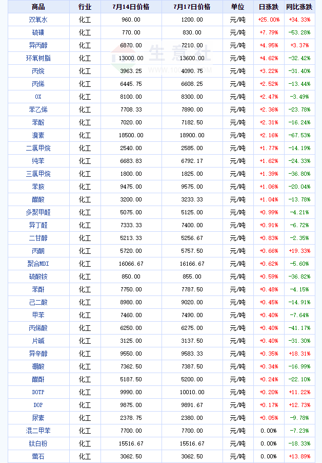截止2023年7月17日17点,国内大宗商品价格涨跌榜中化工板块环比上升的商品共32种,其中涨幅5%以上的商品共2种,占该板块被监测商品数的1.8%;涨幅前3的商品分别为双氧水(25.00%)、硫磺(7.79%)、异丙醇(4.95%)。环比下降的商品共有10种,跌幅在5%以上的商品共1种,占该板块被监测商品数的0.9%;跌幅前3的产品分别为硫酸(-6.90%)、四氢呋喃(-0.82%)、碳酸二甲酯(-0.69%)。