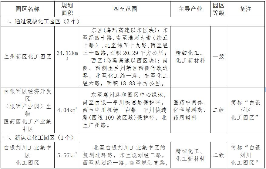 12家园区分别为瓜州工业集中区柳沟煤化工产业园化工产业园区、玉门经济开发区老市区化工工业园、金塔工业集中区北河湾循环经济产业园化工产业园区、玉门经济开发区玉门东建材化工工业园化工产业区、白银高新区化工园区、甘肃高台工业园区南华工业园化工产业集中区、甘肃高台工业园区盐池工业园、金昌经济技术开发区化工产业集中区、张掖经济技术开发区循环经济示范园化工产业集中区、武威民勤红沙岗能源化工工业集中区精细化工园区、民乐工业园区化工产业园、金昌经济技术开发区河西堡工业园。6月底,庆阳西峰工业园区被认定为化工园区。