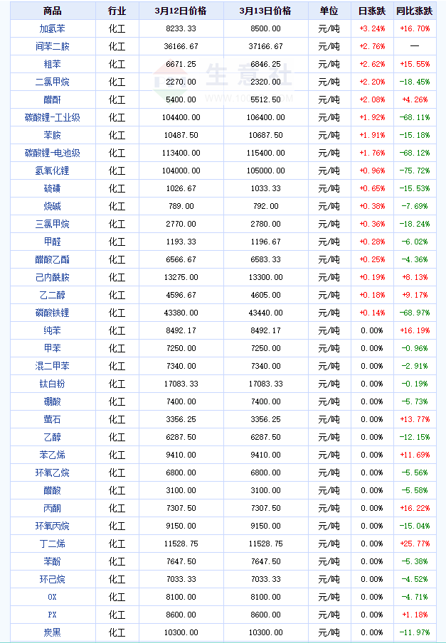 2024年3月13日大宗商品价格涨跌榜中化工板块环比上升的商品共17种,涨幅前3的商品分别为加氢苯(3.24%)、间苯二胺(2.76%)、粗苯(2.62%)。环比下降的商品共有20种,跌幅前3的产品分别为丙烯酸异辛酯 (-3.60%)、煤焦油(高温)(-1.27%)、硫酸铵(-1.14%)。